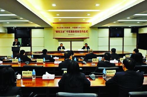 为切实缓解中小企业融资难问题,进一步加强纳税信用体系建设,树立纳税信用价值导向,近日,中山市地税局与中国银行中山分行达成合作协议。银税双方于3月12日下午进行了“银税互动”守信激励措施的签约仪式,就纳税服务和金融服务方面建立起全面、长期和稳定的战略合作关系,打造税、企、银的三赢局面。