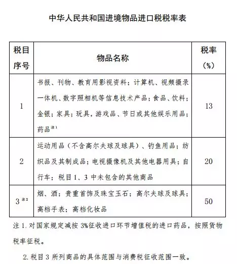 一、将进境物品进口税税目1、2的税率分别调降为13%、20%
